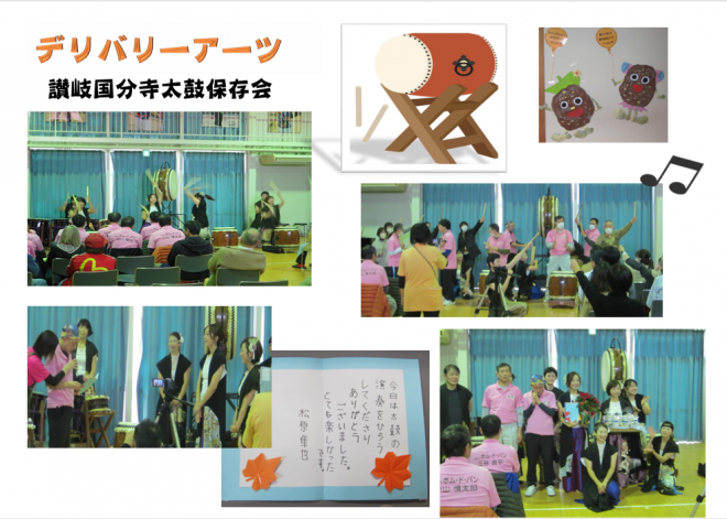 先月11月26日にデリバリーアーツが開催され、讃岐国分寺太鼓保存会の方々による和太鼓演奏を披露頂きました。当日は寒い中、たくさんの方々にご来所頂けて大変うれしく思います。ありがとうございました❕❕ 太鼓を打つという素敵な体験もさせて頂けて、来所された方と共演もしました。 あっという間でしたが、楽しい時間を過ごしました。また来年もぜひ宜しくお願いします。