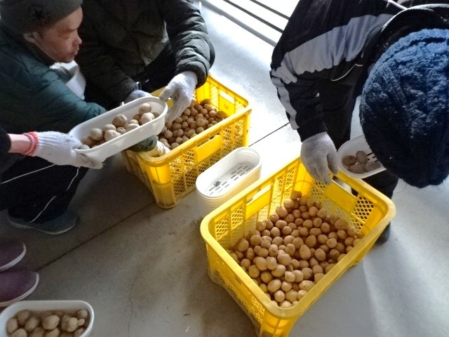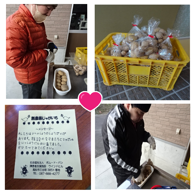 昨年10月3日に橋本種苗園様より、種芋を頂いて植えていたじゃがいもが、ウインドヒルにて収穫されました!大きさは不揃いですが、たくさん収穫することが出来ました♪採れたじゃがいもは、利用者さんが大中小のサイズごとに分別して袋詰めまで行います。地元の方にも食べて頂きたいと思い、三谷コミュニティセンターや仏生山コミュニティセンターにて販売させていただいております。